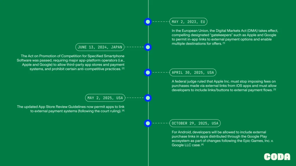 Recent regulatory tailwinds are reshaping the balance between in-app and out-of-app payments & purchases. Exactly half a year after the Epic v. Apple landmark ruling, the same level of in-app monetization freedom and flexibility that was introduced for iOS app publishers have now been extended to Android app publishers as well.